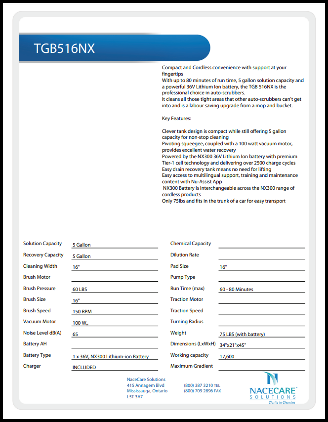 Avec les performances de nettoyage d'une machine beaucoup plus grande, le TGB 516NX est idéal pour nettoyer les espaces plus restreints et les grands espaces publics. La conception innovante du réservoir est compacte tout en offrant une capacité de 5 gallons pour un nettoyage continu. Le TGB 516NX permet d'obtenir des sols propres, secs, sûrs et sans traces en quelques minutes.