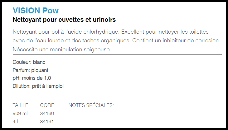 Nettoyant pour cuvette à base d'acide chlorhydrique. Excellent pour nettoyer les toilettes avec de l'eau lourde et des taches organiques. Contient un inhibiteur de corrosion. Manipulation minutieuse requise.