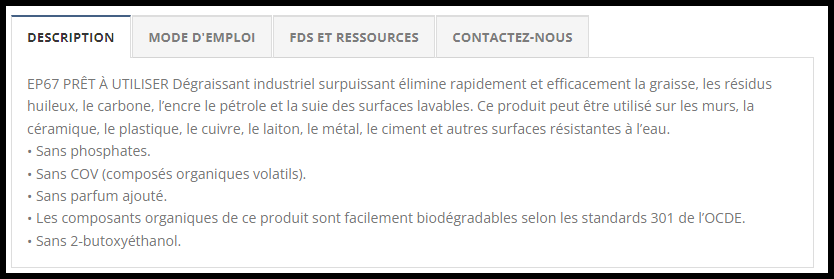 EP67 Dégraissant industriel surpuissant élimine rapidement et efficacement la graisse, les résidus huileux, le carbone, l’encre le pétrole et la suie des surfaces lavables. EP67 peut être utilisé sur les planchers, les murs, la céramique, le plastique, le cuivre, le laiton, le métal, le ciment et autres surfaces résistantes à l’eau. Sans phosphates. Sans COV (composés organiques volatils). Sans parfum ajouté. Les composants organiques de ce produit sont facilement biodégradables selon les standards 301 de l’OCDE. Sans 2-butoxyéthanol.